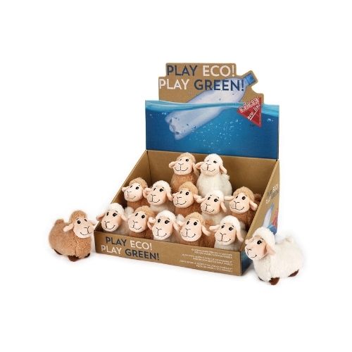 Présentoir avec 12 peluches mouton en bouteilles plastiques recyclées.