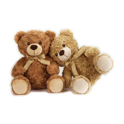 Ours Taffy beige ou marron avec extérieur à bouclettes. En bouteilles plastiques recyclées, certifié 100% GRS Intertek.