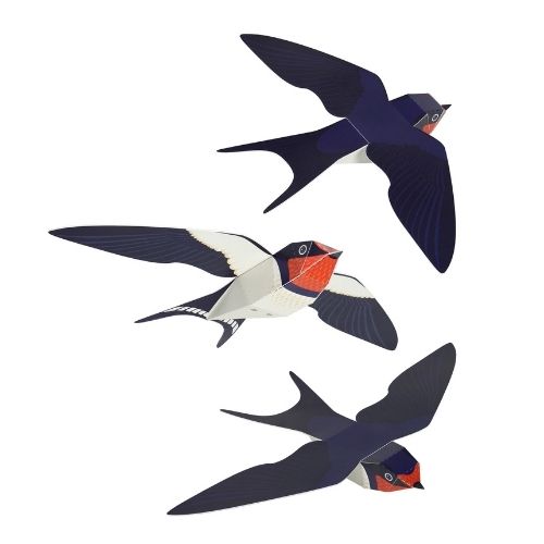 3 hirondelles en papier FSC 100% recyclé, à construire soi-même.
