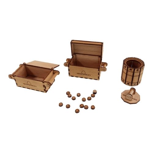 Kit avec 60 pièces en bois pour construire 2 coffres, 1 baril et autre accessoires soi-même.